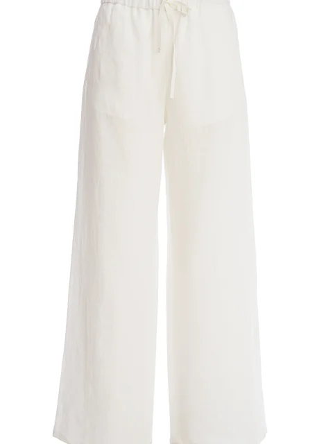 Детали: прямой свободный от бедра крой, средняя посадка, прорезные карманы-листочки, пояс на кулиске со шнурком.