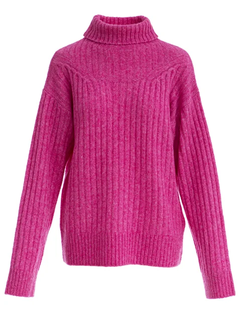 Детали: овальный свободный крой, высокий ворот с отворотом, спущенный длинный рукав, узор вязки в рубчик.