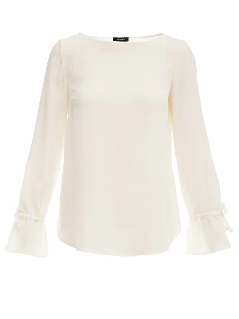 Детали: прямой крой, вырез горловины лодочкой, длинный втачной рукав с кулиской и оборкой, закруглённый нижний край.