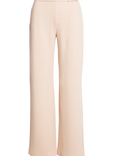 Детали: прямой свободный от бедра крой, высокая посадка, эластичный пояс, прорезные боковые карманы, декоративная вставка с кристаллами под поясом.