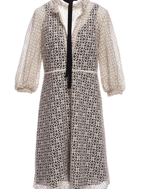 Детали: А-силуэт, V-образная форма декольте с воротом-стойкой и планкой, втачной рукав длиной ¾, собранный тонкой манжетой, отрезная линия талии, юбка длиной до колена, контрастная подклада. Шейный галстук.