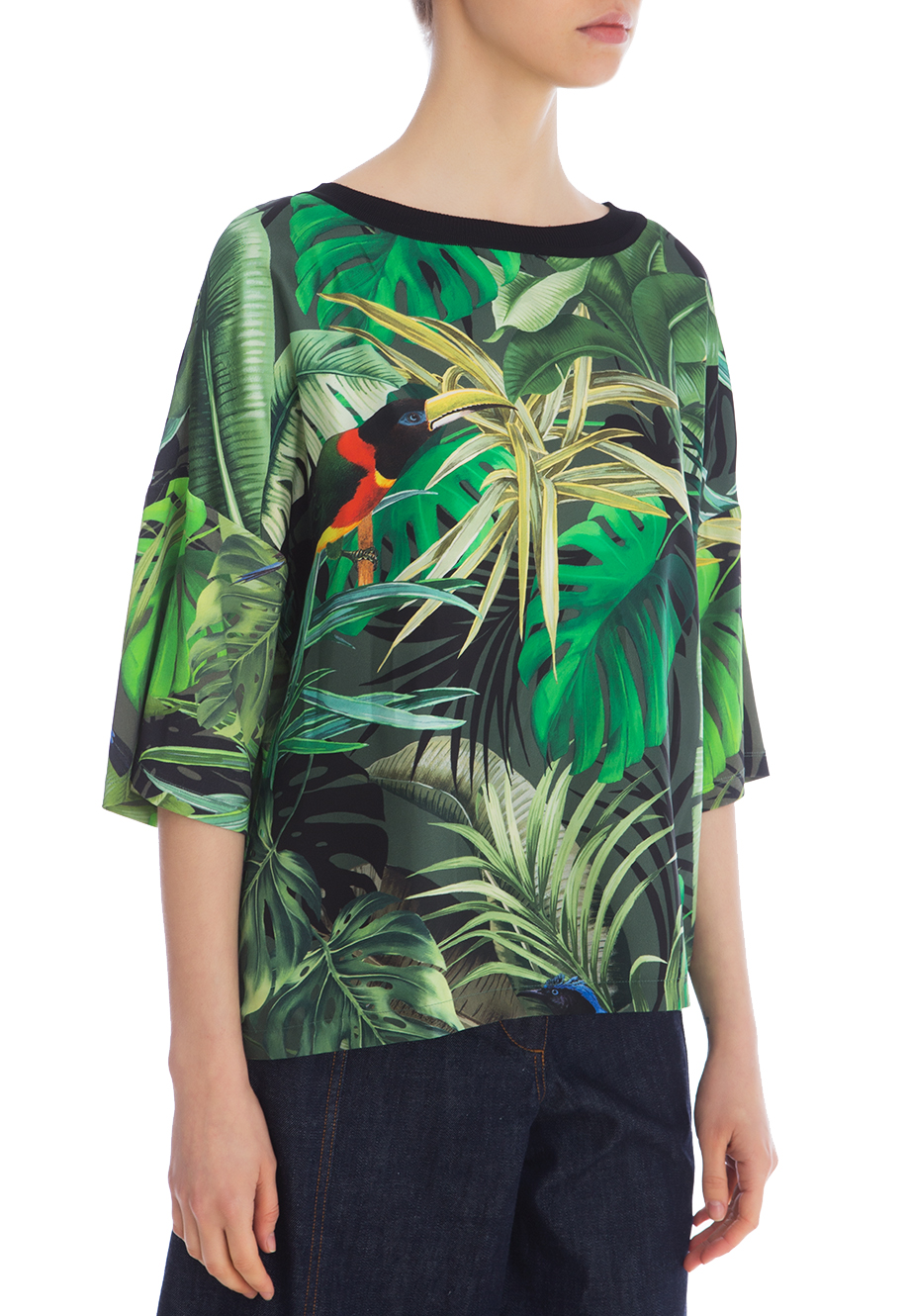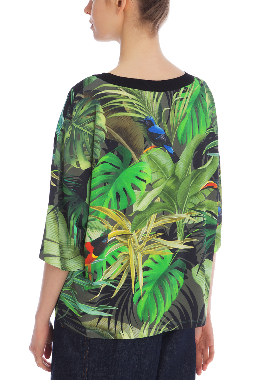 Детали: прямой свободный крой, круглый вырез горловины с контрастной трикотажной манжетой, спущенный втачной рукав длиной до локтя.