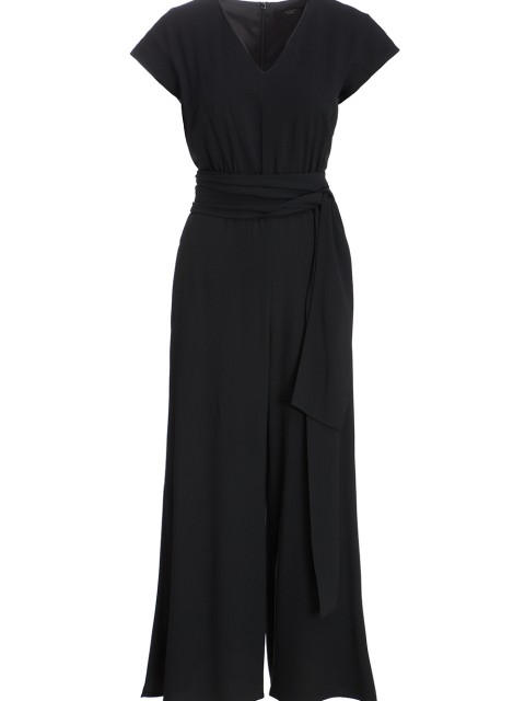 Детали: прямой крой, V-образная форма декольте, цельнокроеный короткий рукав, пояс-кушак по линии талии, брюки клёш от бедра с разрезами по штанинам.