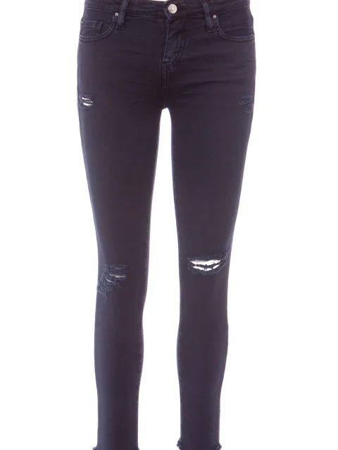 Детали: облегающий крой, высокая посадка, пять традиционных карманов, на коленях  асимметричные прорехи с бахромой и небольшие на бёдрах. Длина до щиколотки, край штанины необработанный с бахромой, пояс с шлевками для ремня и пуговицей, ширинка.