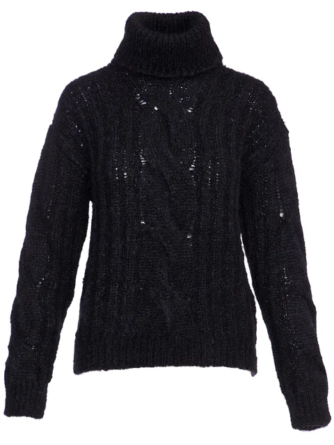 Детали: прямой крой, высокий ворот с отворотом, длинный втачной рукав, фактурная вязка с узором.