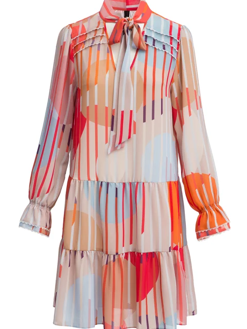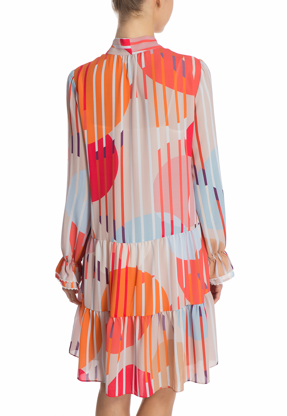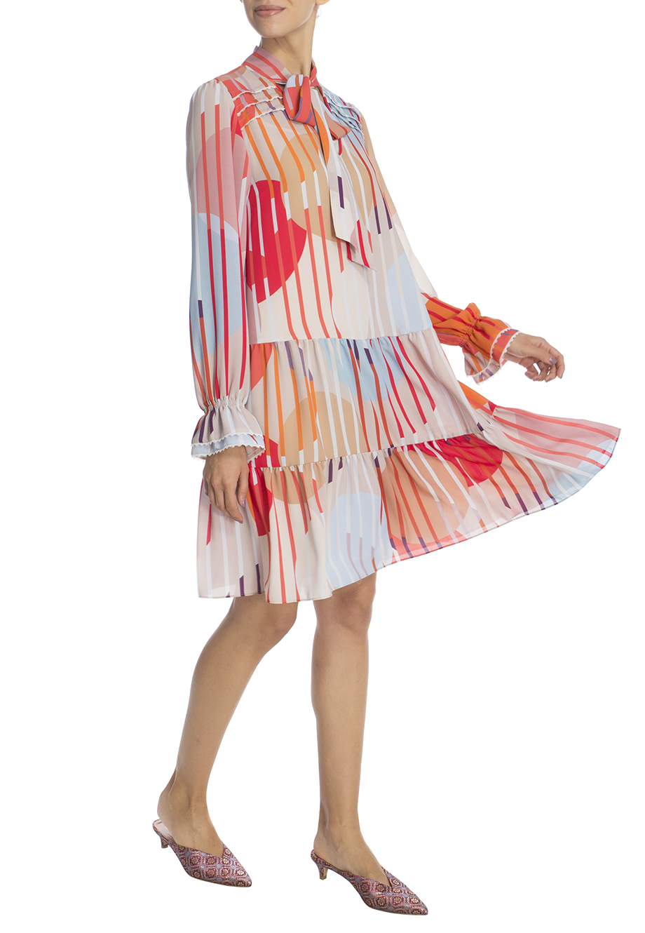 Детали: А-силуэт, ворот стойка с завязкой, длинный втачной рукав с оборкой по краю, отрезная заниженная линия талии с двумя рядами оборок, длина до колена, абстрактный принт.