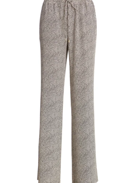 Детали: прямой свободный от бедра крой, высокая посадка, пояс на кулиске с резинкой, французские боковые карманы, тонкий лампас по боковому шву, монохромный микропринт.