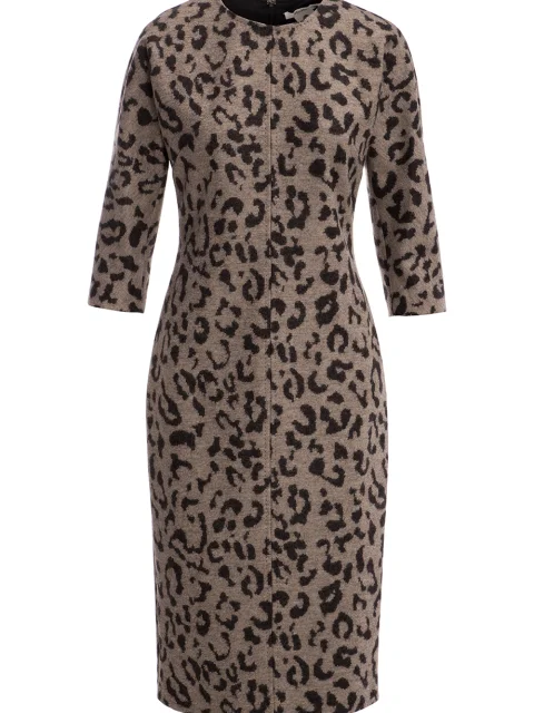 Детали: приталенный крой, круглый вырез горловины, цельнокроеный рукав длиной ¾, шлица на спинке, длина ниже колена, жаккардовое плетение, леопардовый принт.