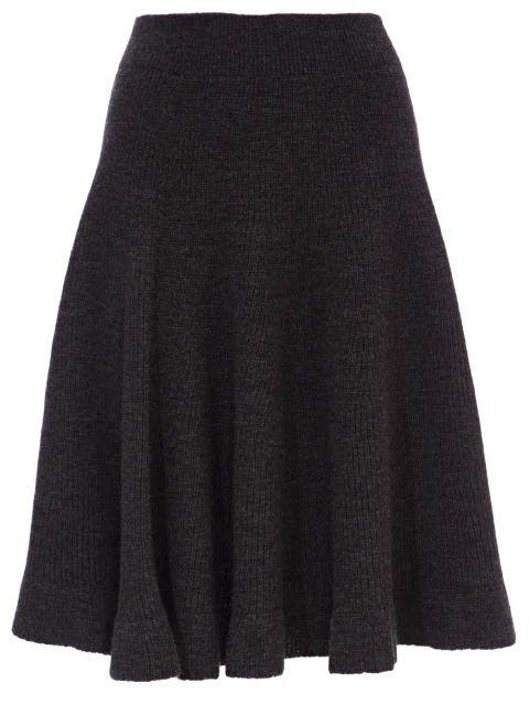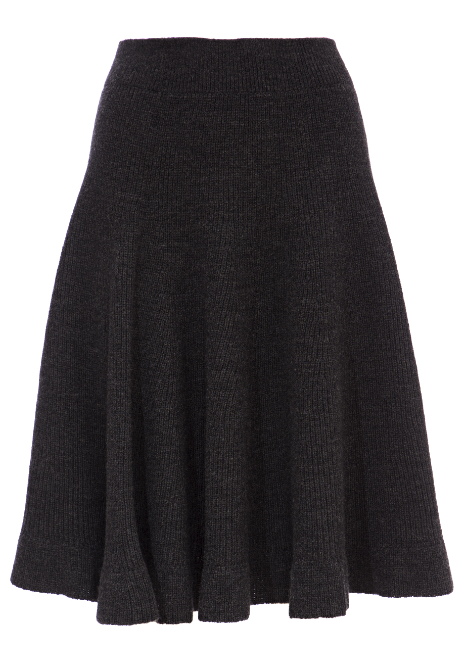 Детали: А-силуэт, крой-полусолнце, высокая посадка, вязаный эластичный пояс, вязка резинкой, длина до колена.