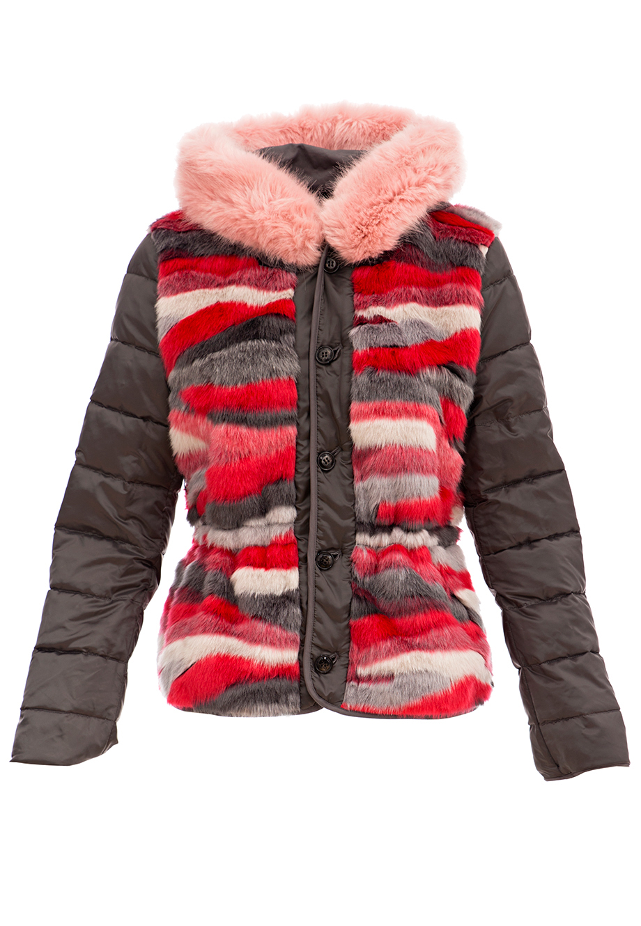 Детали: короткая крутка-парка прямого кроя с прорезными карманами с клапаном, длинный втачной рукав, круглый отложной воротник, удлинённая спинка с разрезом и кулиской. Застёгивается пуговицами с клапаном. Двусторонняя куртка – поддёвка сатиновая, с кулиской по линии талии, застёгивается рядом пуговиц, с одной стороны, с другой - стёганая, с капюшоном и меховой опушкой, с отделкой из цветного меха.