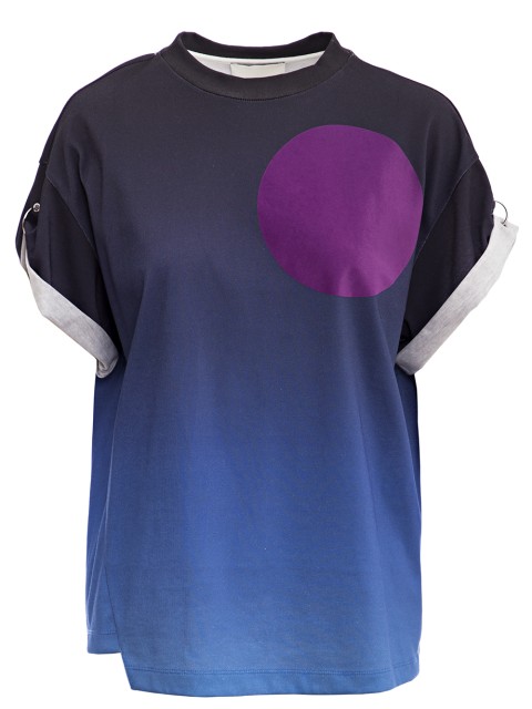 Детали: прямой крой, круглый вырез горловины, короткий рукав с подкатом и декоративными фиксирующими кольцами, градиент цвет.
