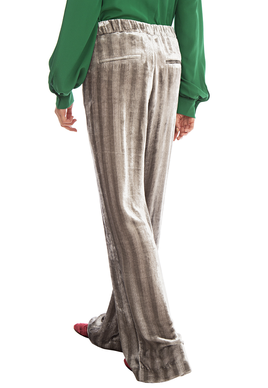 Детали: прямой свободный крой от бедра, средняя посадка, эластичный пояс, французские боковые карманы, сзади два прорезных с рантом. Узор ткани – вертикальная полоска.