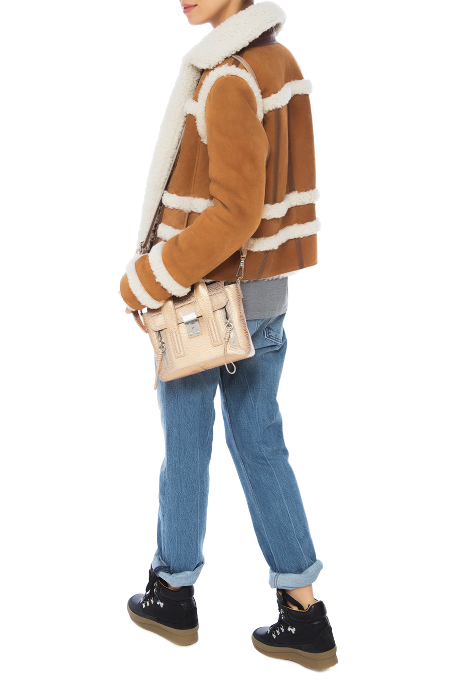 Детали: прямой укороченный крой, отложной меховой воротник с лацканами, наружные швы, два прорезных кармана по бокам, на линии талии декор из люверсов. Застегивается молнией с кожаной отделкой.