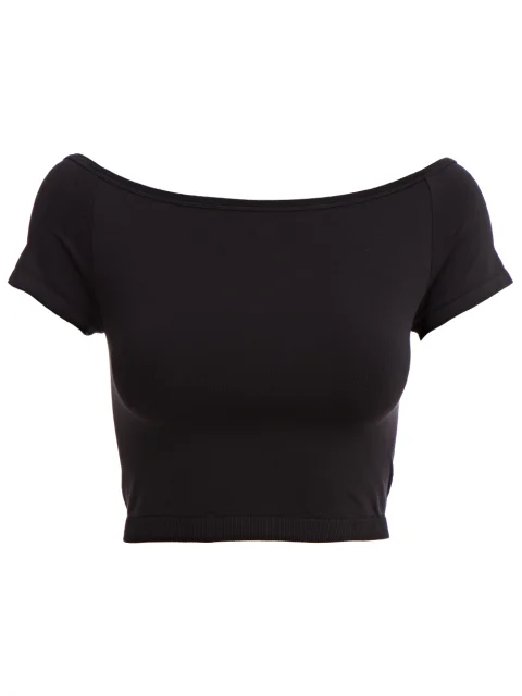 Детали: облегающий укороченный крой, глубокий вырез лодочкой, короткий рукав реглан.