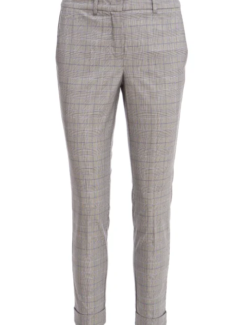 Детали: прямой крой, слегка зауженный книзу, средняя посадка, французские боковые карманы, сзади один прорезной с рантом и пуговицей. Пояс со шлевками для ремня, потайной крючок, ширинка. Длина 7/8, подвороты. Принт - клетка «Принц Уэльский»