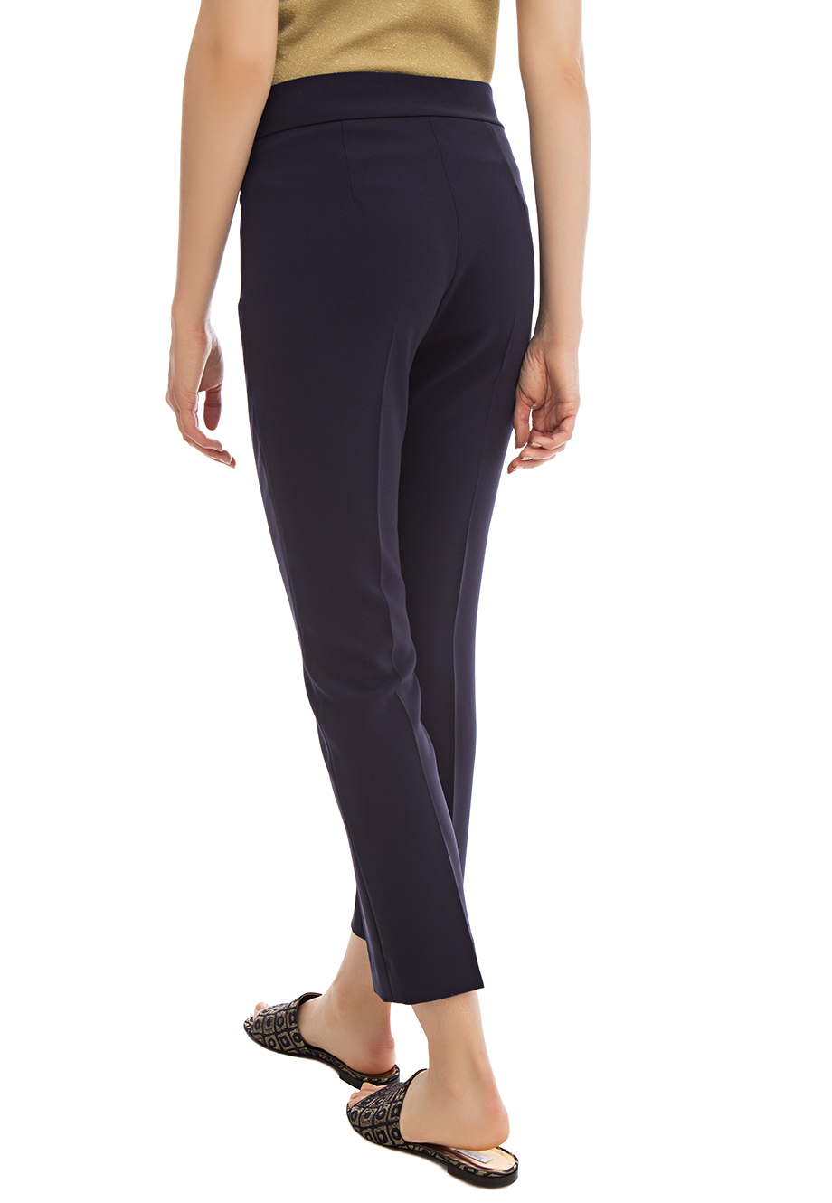Детали: прямой крой, высокая посадка, длина 7/8, стрелки вдоль штанин, широкий пояс с потайной молнией сбоку.