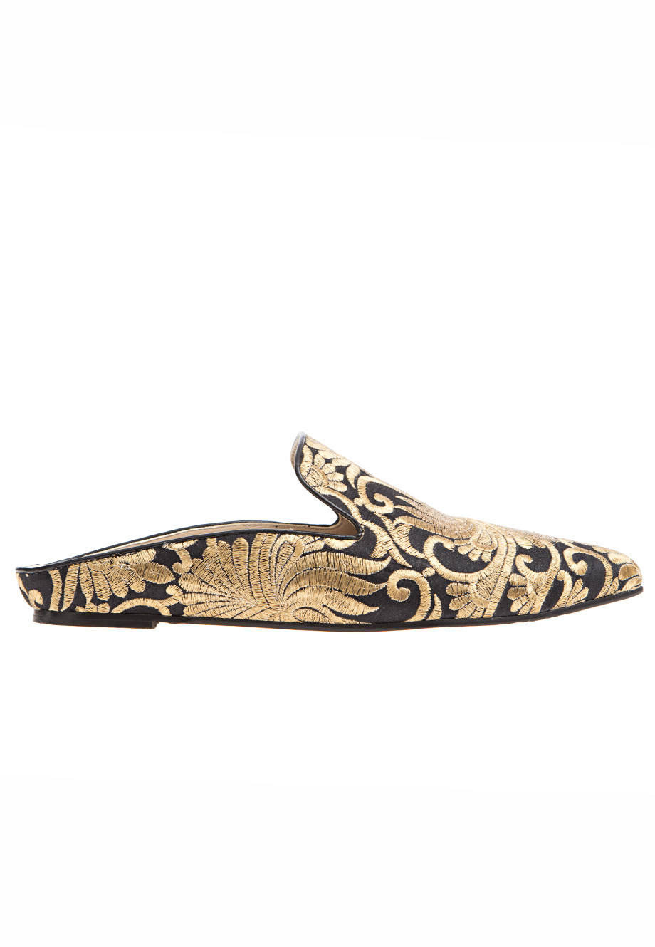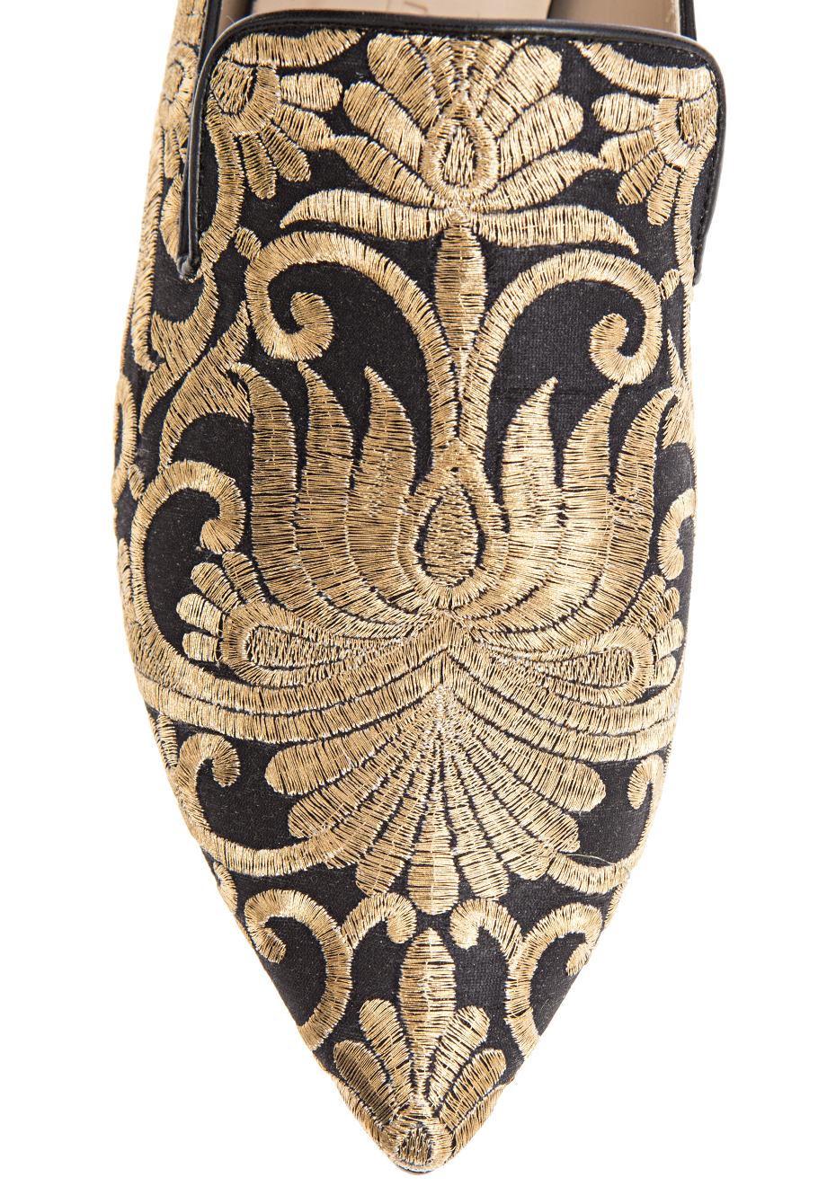 Детали: удлиненный носок, плоская подошва, каблук высотой 0,5 см, вышитый узор золотистого цвета, внутренняя отделка из кожи.