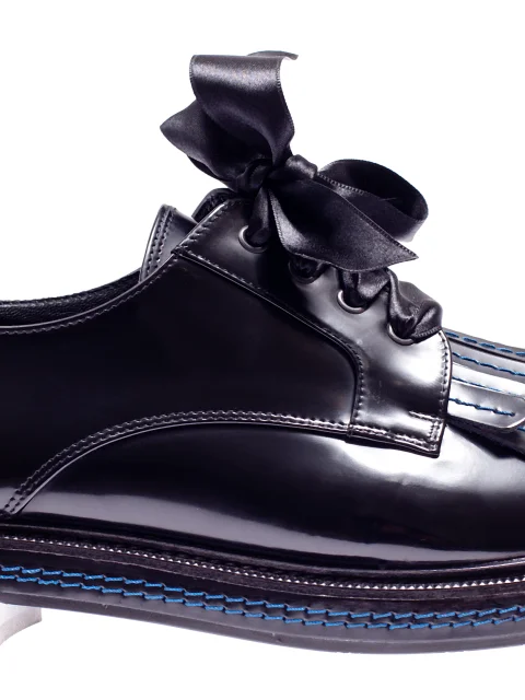 Детали: гладкая глянцевая кожа, закруглённый носок, два ряда бахромы на союзке, перестрочка синего цвета на кистях и подошве, шнуровка из атласной ленты. Каблук высотой 2 см.
