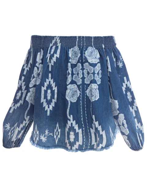 Детали: прямой свободный крой, длинный рукав, собранный тонкой манжетой, открытая линия плеч, эластичная резинка по пройме. Бахрома по нижнему краю, орнамент.
