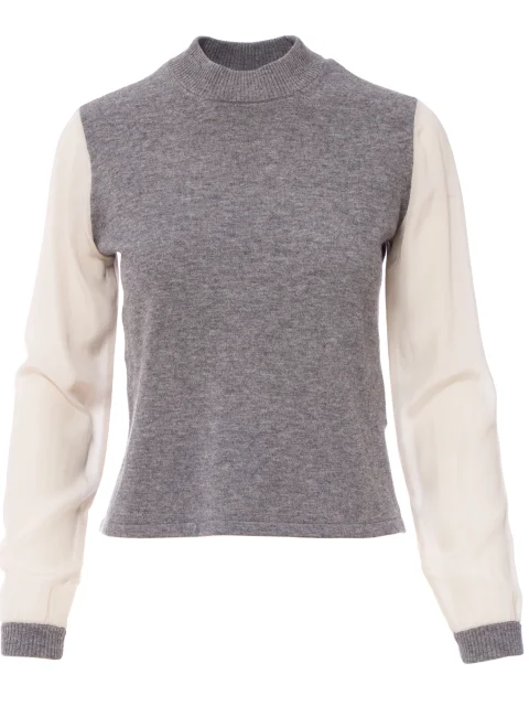 Детали: прямой крой, высокий ворот, длинный втачной рукав из шифона, собранный манжетами из джерси.