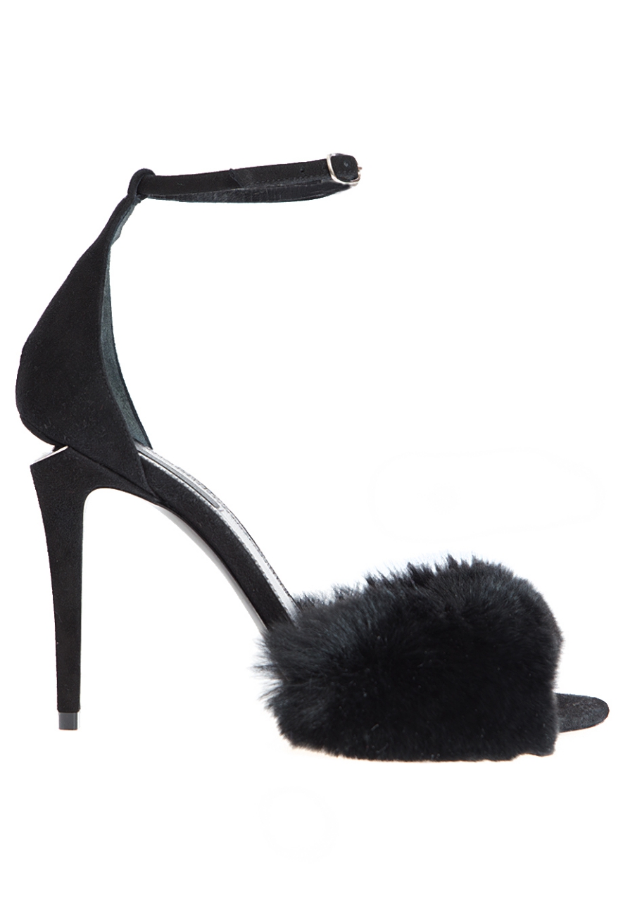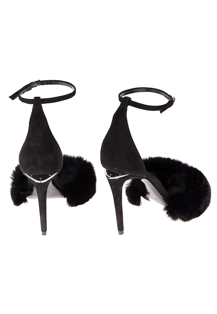Детали: закруглённый носок, шпилька высотой 10 см с декоративной стальной пластиной, замшевый задник с тонким ремешком вокруг щиколотки, перепонка с меховой опушкой.