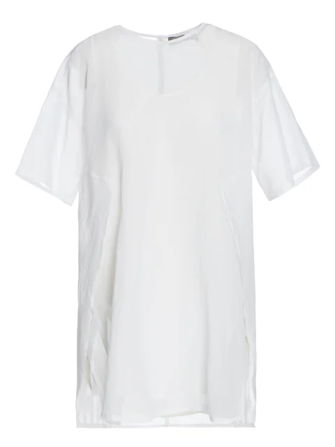 Детали: прямой крой, круглый вырез горловины, спущенный короткий рукав, глубокие боковые разрезы внахлёст, нижний топ.