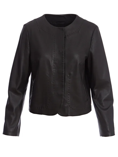 Детали: гладкая матовая кожа, прямой укороченный силуэт, круглый вырез горловины, длинный втачной рукав, прорезные карманы с рантом по бокам, декоративная ручная стежка по канту края, ворота и карманов. Застегивается планкой со скрытыми пришивными кнопками.