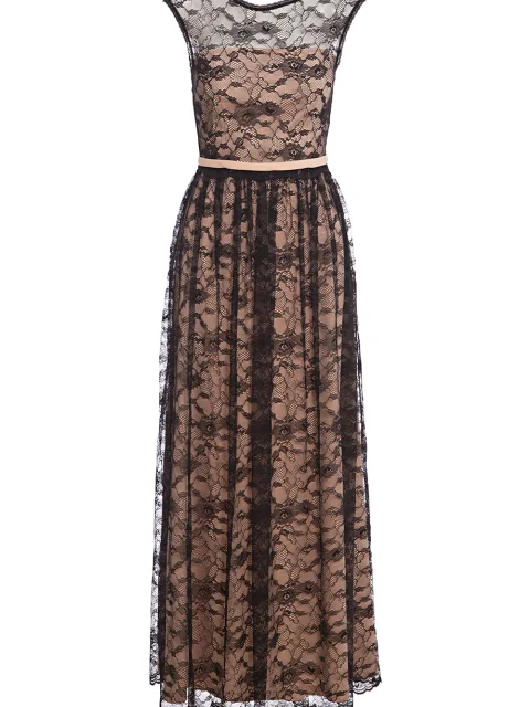 Детали: отрезная линия талии, облегающий крой лица, вырез горловины лодочкой спереди и мысом на спинке. Без рукавов. Внутренний чехол из кремапудрового оттенка, верхний слой – тонкое чёрное кружево. Юбка-макси с мягкими складками и фигурным подолом. Линия талии подчёркнута вшитым поясом. Застёгивается рядом пуговиц на спинке.