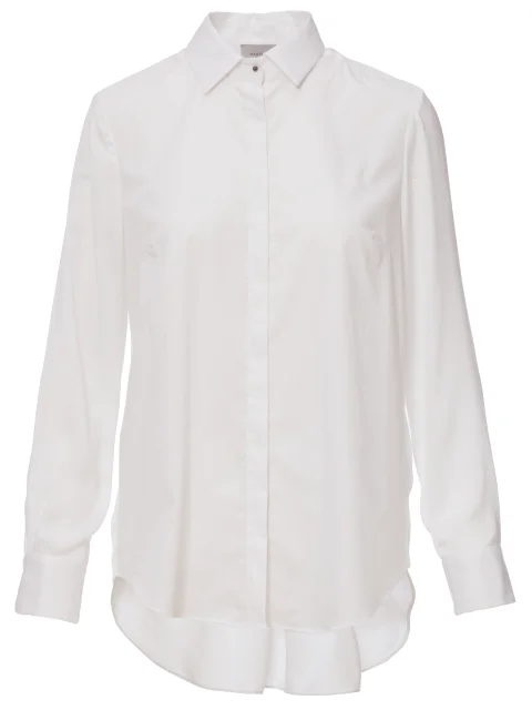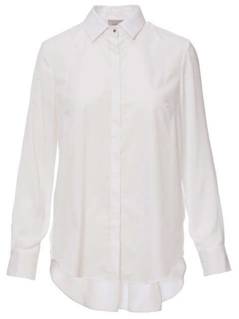 Детали: прямой свободный силуэт, отложной воротник с заострёнными краями, выточки на груди, длинный рукав с манжетом; декоративная пуговица на воротнике, скрытая планка с пуговицами; передняя часть и рукава – из хлопкового поплина, спинка – удлинённая, из струящегося крепдешина.
