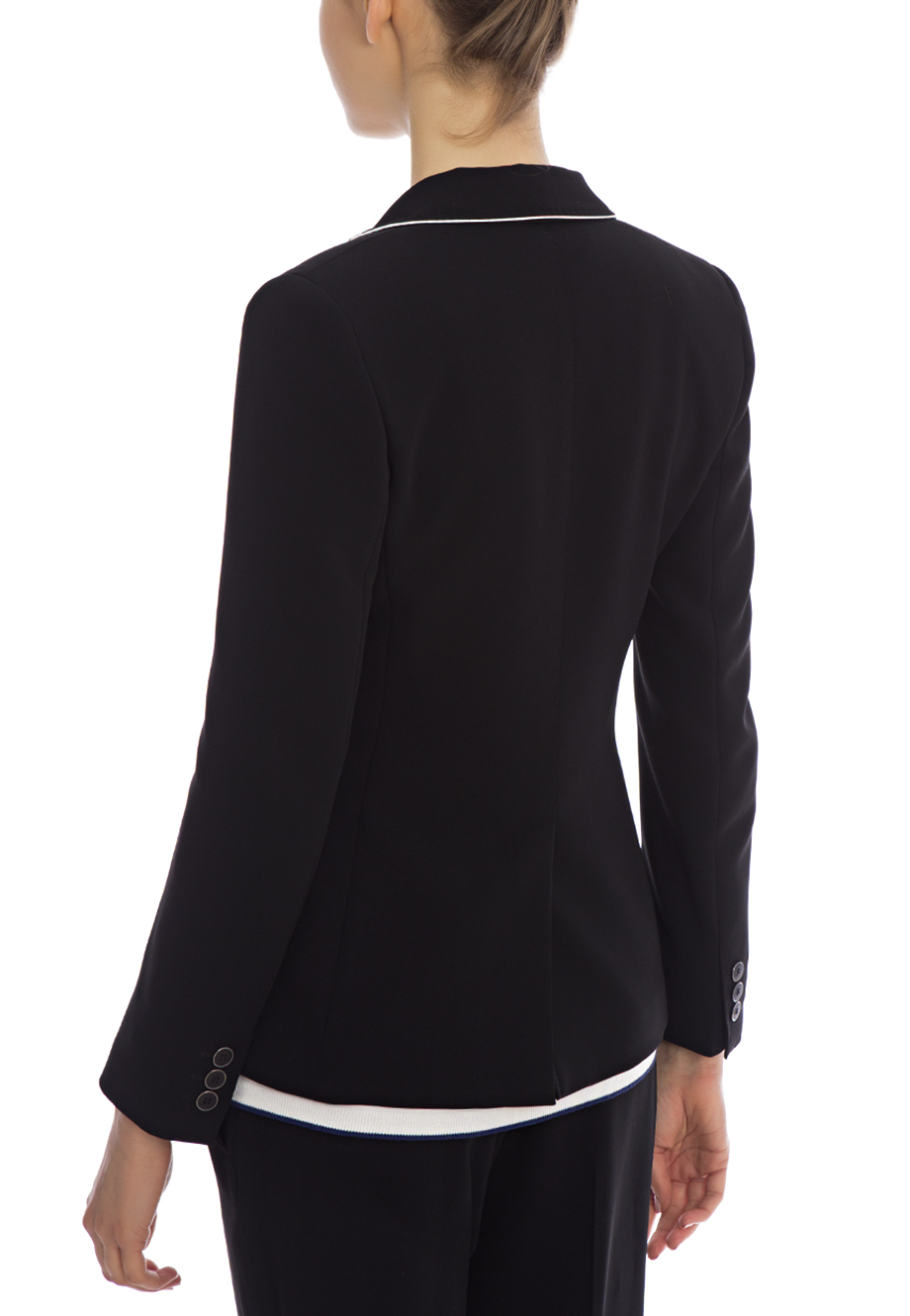 Детали: облегающий крой, отложной воротник с лацканами, укороченный втачной рукав, контрастный кант по краю, по бокам накладные карманы с кантом. Застёгивается одной пуговицей.