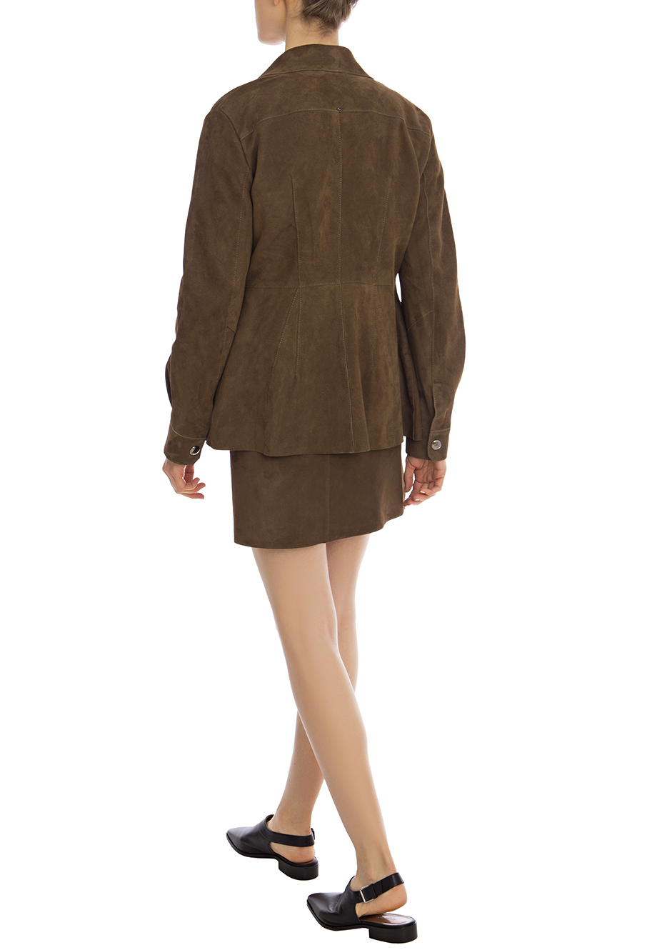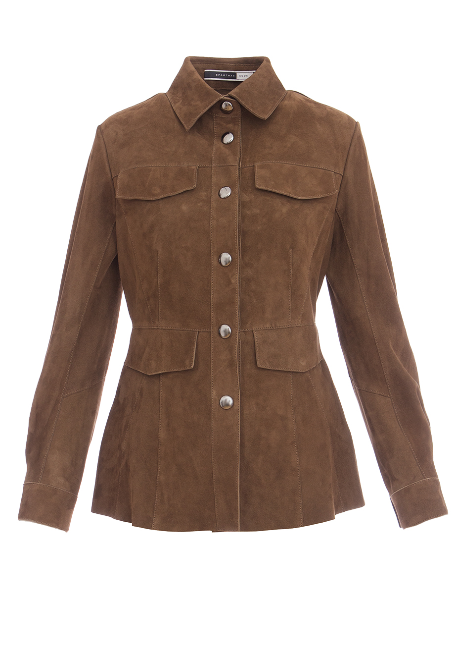 Детали: облегающий крой, слегка расклешённый книзу, отложной ворот, длинный втачной рукав с манжетой на пуговице, четыре псевдо-кармана с клапанами, планка с рядом пуговиц.