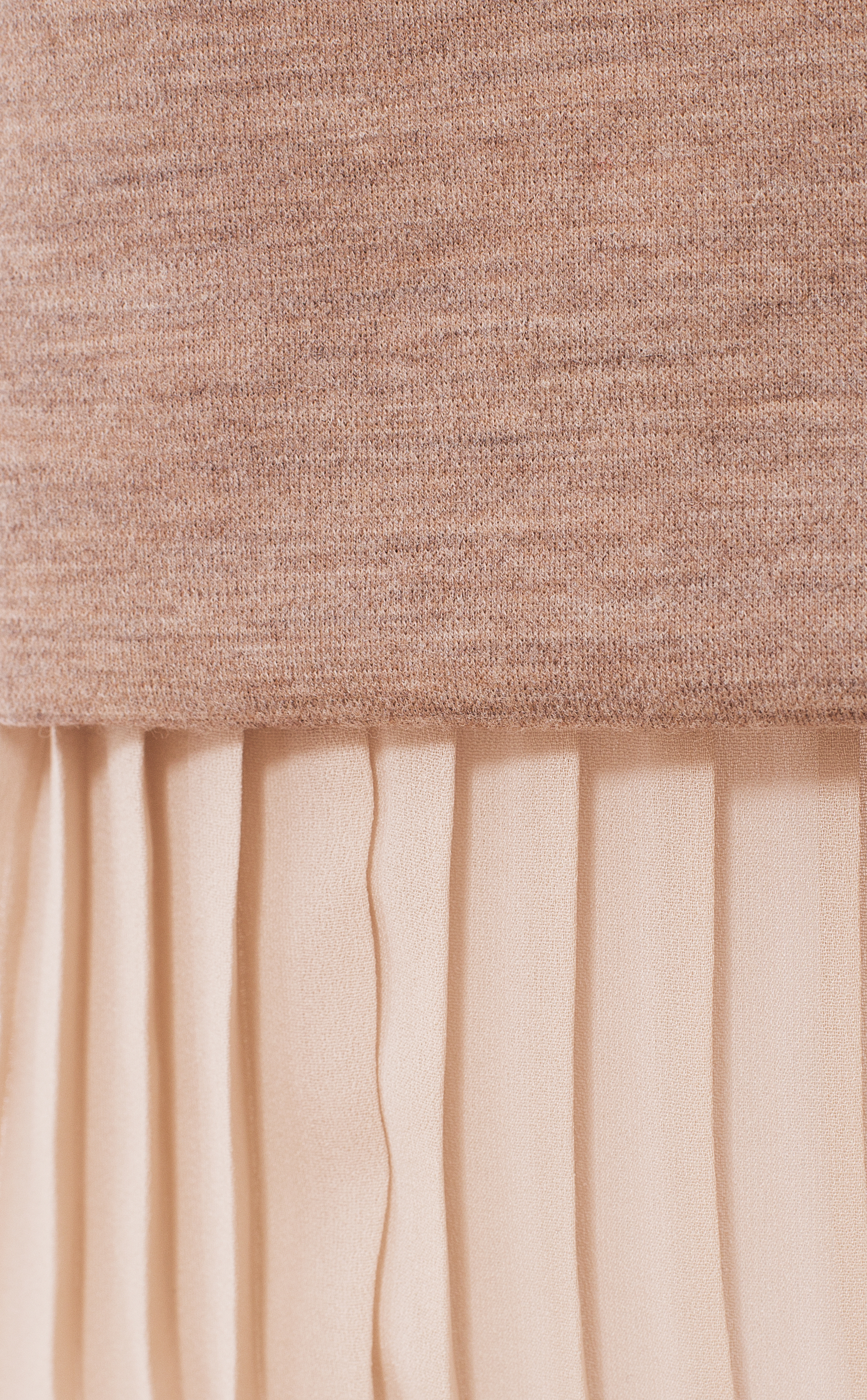 Детали: облегающий силуэт, длина ниже колена, высокая посадка. На спинке застегивается потайной молнией, по середине – одна шлица. По подолу декорирована плиссировкой из креп-шифона.