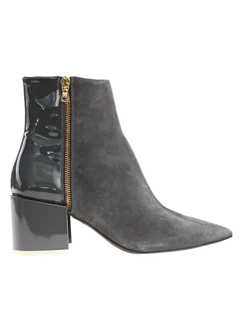 Детали: заострённый носок, голенище с декоративной молнией снаружи, устойчивый полукруглый каблук, задняя часть из лаковой кожи. Каблук высотой 6 см.