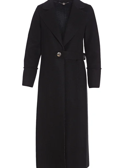 Детали: прямой крой, отложной воротник с лацканами, длина до середины голени, длинный втачной рукав с манжетом и наружным швом. Застегивается на запах асимметричным поясом с золотистой кнопкой. Без подклады.