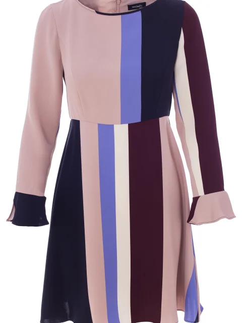 Детали: облегающий крой лифа, отрезная линия талии, струящийся силуэт юбки. Длинный рукав с рюшей по краю, круглый вырез горловины, длина до середины бедра. Застегивается молнией на спинке и декоративным шнурком.