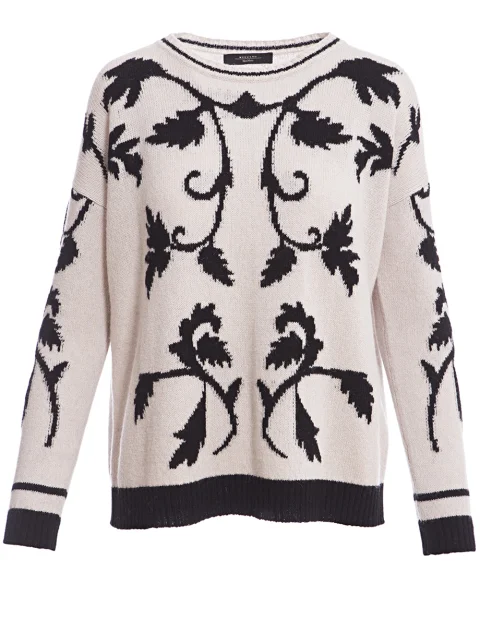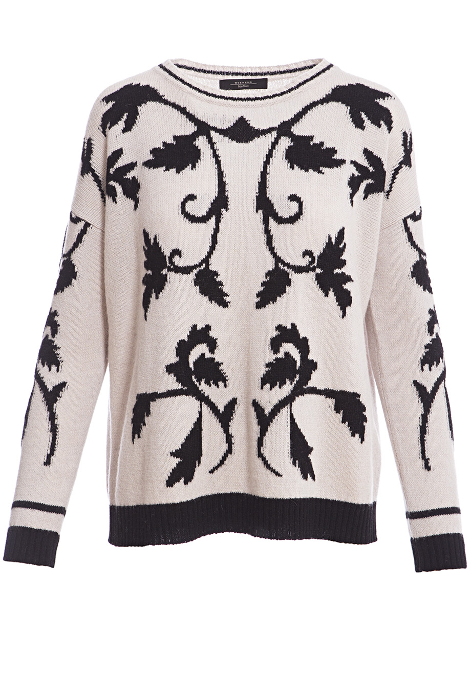 Детали: прямой крой, вырез горловины лодочкой, спущенный рукав с контрастным манжетом и кантом. Широкий чёрный манжет по нижнему краю, вокруг горловины тонкий чёрный кант. Вязаный монохромный узор.