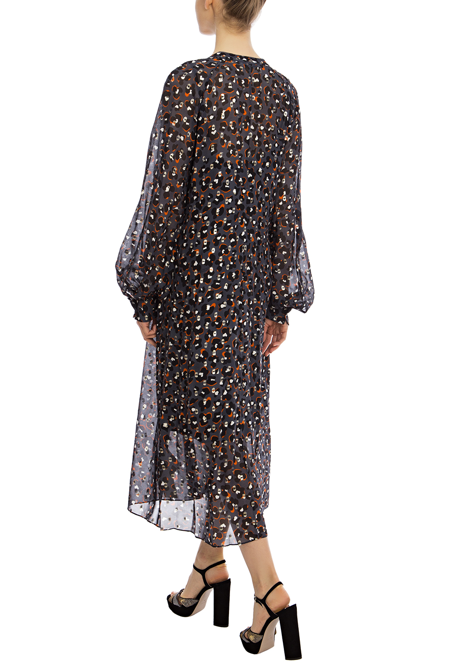 Детали: прямой крой, круглый вырез горловины с мысом и планкой, длинный втачной рукав, собранный широкой манжетой. Внутренний чехол-комбинация. Монохромный принт.