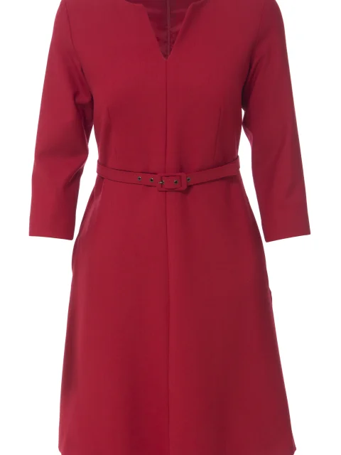 Детали: отрезная линия талии, юбка А-силуэта длиной выше колена. Круглый вырез горловины с мысом, рукава длиной ¾, линия талии подчёркнута поясом с пряжкой и люверсами.