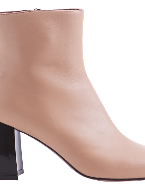 Детали: светлая бежевая кожа, округлый носок, по центру строчка, с внутренней боковой стороны застегивается на молнию, глянцевый, квадратный, слегка выпуклый каблук; гладкая подошва бордового цвета, внутренняя отделка из кожи.