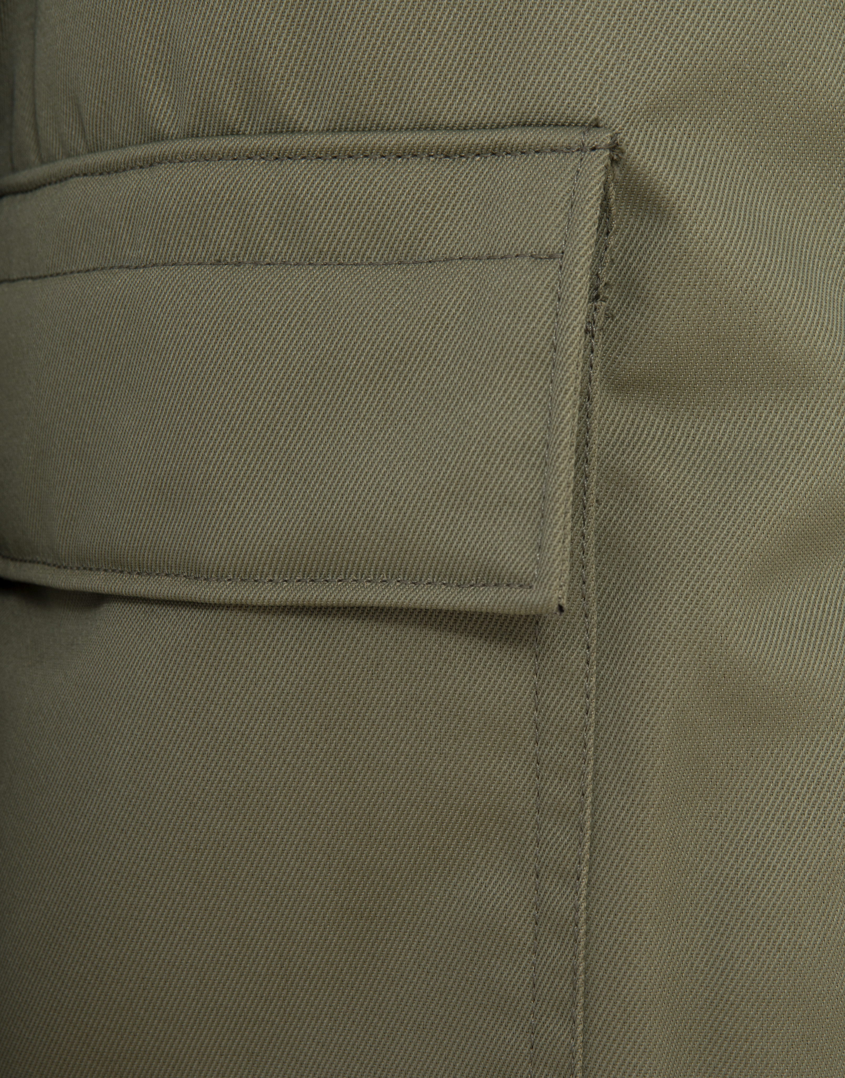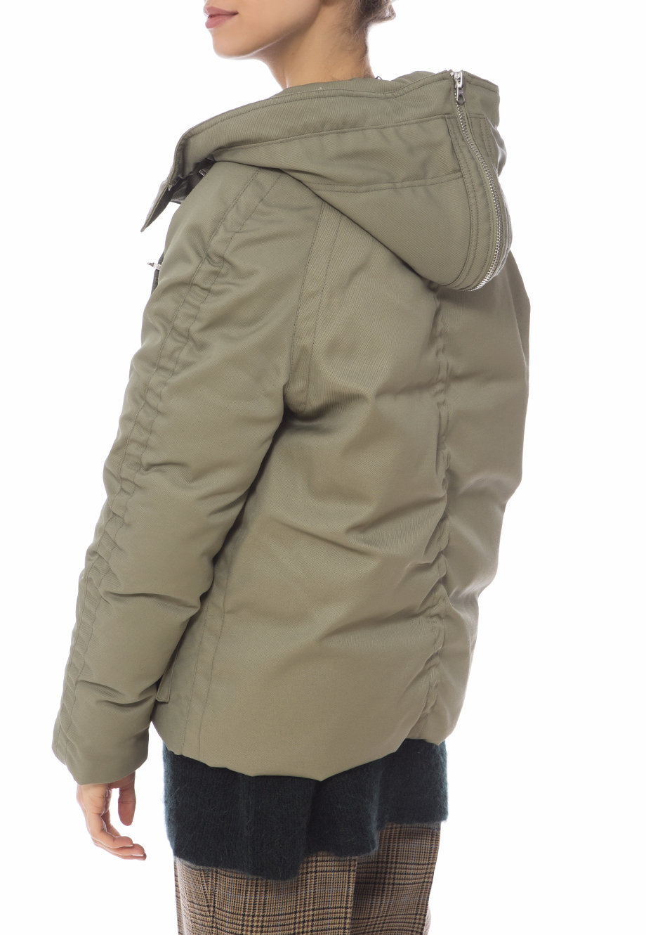 Детали: прямой крой oversize, высокий ворот стойка, большой тёплый капюшон с молнией, накладные карманы с клапанами по бокам, на спинке продольная декоративная затяжка. Подклада яркого оранжевого цвета. Застегивается молнией и клапаном с кнопками.