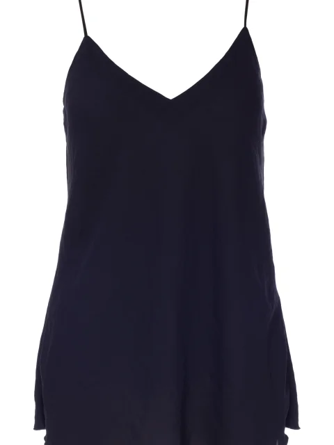 Детали: свободный крой, тонкие бретели регулируемой длины. V-образный вырез декольте, фактурная кромка по нижнему краю.