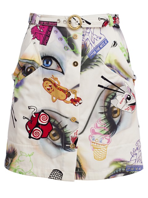Детали: трапециевидный силуэт, высокая посадка, карманы-карго с широким рантом по бокам, планка с пуговицами, пояс со шлевками и ремнем с круглой пряжкой, фирменный сезонный принт Visage.