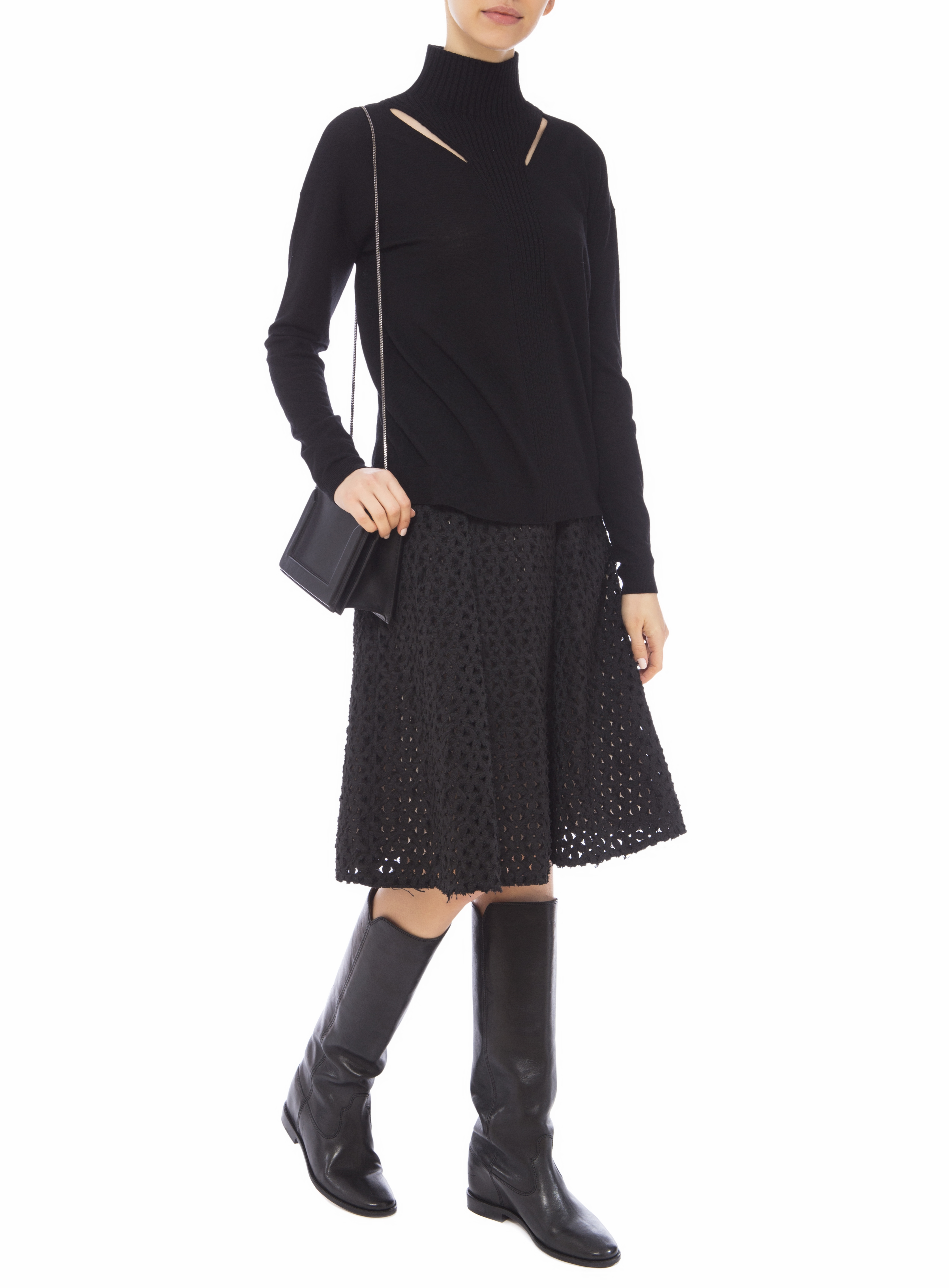 Детали: прямой крой, высокий ворот, длинный рукав. Под горловиной по два симметричных разреза на передней полочке и на спинке. От горловины полоса фактурной вязки.