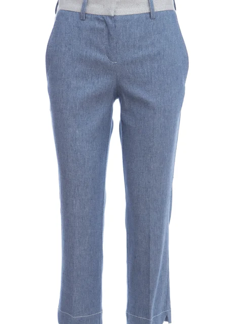Детали: прямой крой, слегка зауженный книзу, средняя посадка, французские боковые карманы, пояс и внутренняя часть карманов из контрастного материала с люрексом, сзади один прорезной карман с клапаном, стрелки вдоль штанин, материал с текстурой денима. Шлевки для ремня, ширинка.