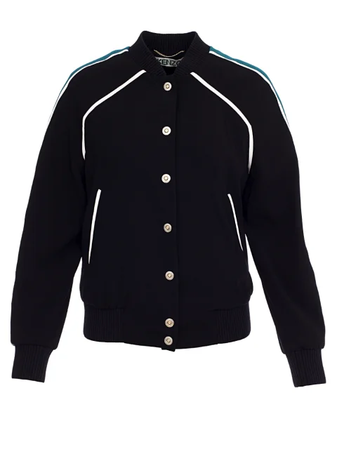Детали: традиционный овальный крой, рукава реглан с лампасами и эластичными манжетами, спортивный воротник, прорезные карманы по бокам с контрастным кантом. Манжета по нижнему краю. На спинке сезонный принт Kenzo Paradise. Застёгивается декоративными кнопками. Материал – креп.