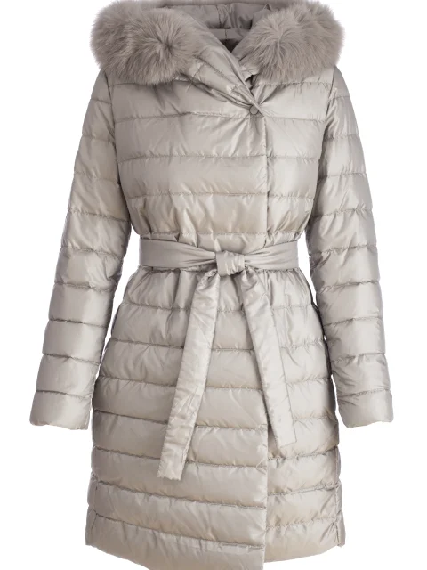 Детали: прямой крой на запах, линия талии подчёркнута поясом. Два пропетых кармана по бокам, большой утеплённый капюшон с опушкой из меха. Застёгивается двумя рядами потайных кнопок. Утеплитель – утиный пух.