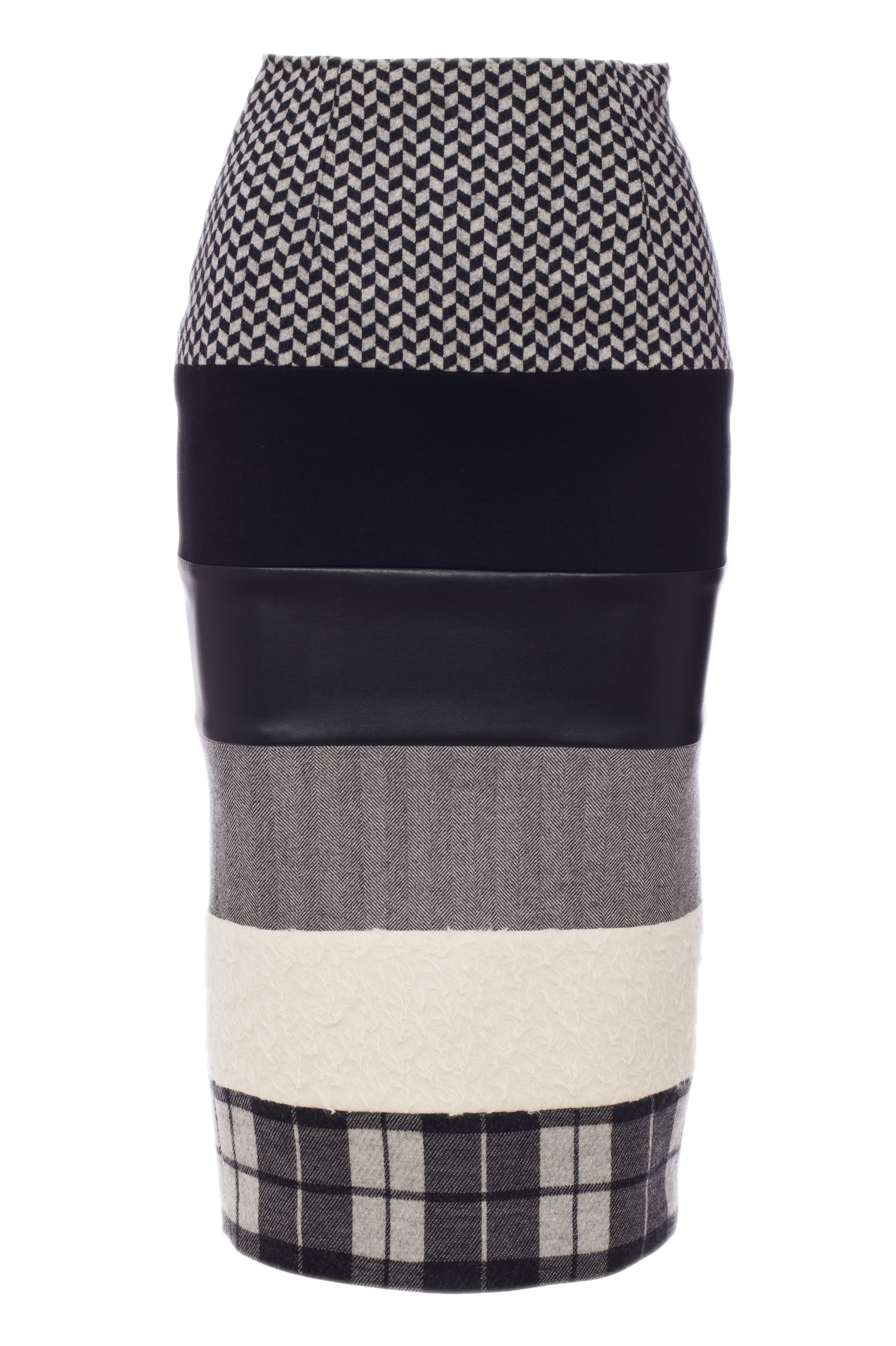 Детали: облегающий крой, высокая посадка, сшита из поперечных полос разных материалов, сочетает разные фактуры и принты. Длина ниже колена, застёгивается молнией на спинке, по середине шлица.