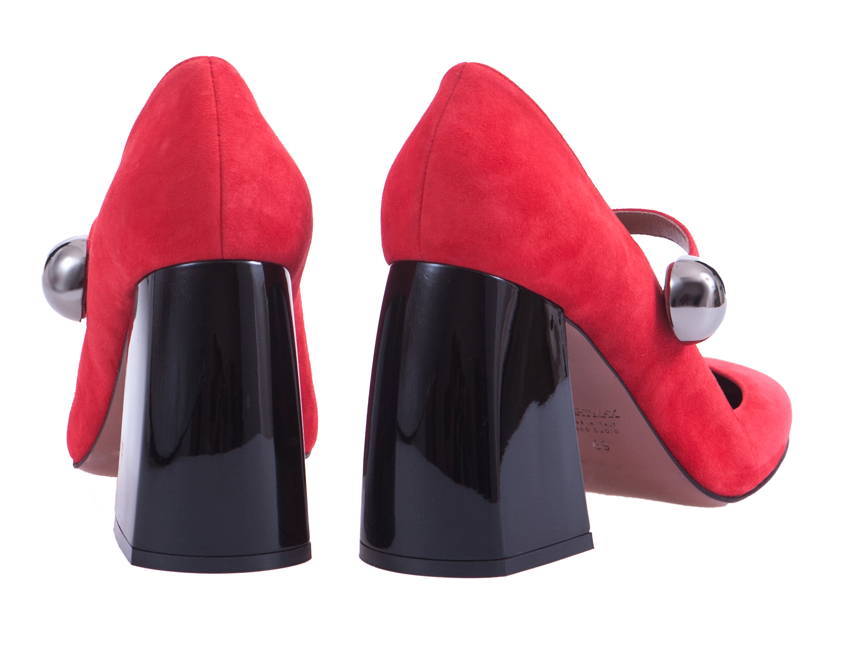 Туфли с круглым носком на блочном, слегка изогнутом каблуке. Впереди тонкий ремень с крупной застежкой в виде металлической полусферы. Внутри натуральная кожа.В комплекте прилагается чехол для хранения.