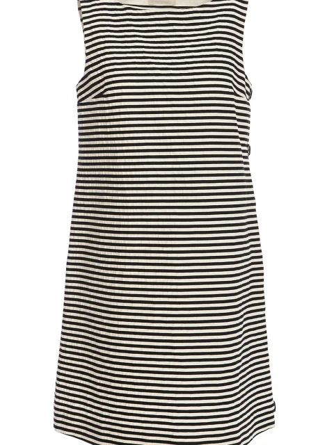 Детали: трапециевидный крой, вырез горловины лодочкой, передняя полочка в частую полоску, спинка – традиционная «французская» полоска. По боковому шву декоративная застежка крупными пуговицами, длина выше колена.