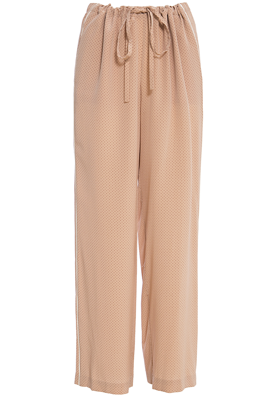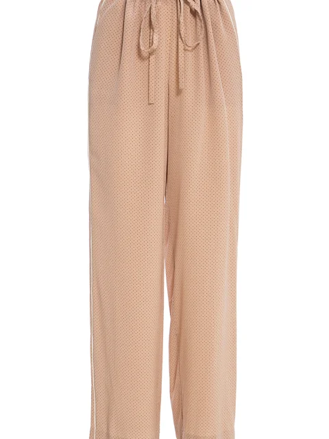 Детали: прямой свободный крой от бедра, текстура замши, перфорация, средняя посадка, пояс на кулиске с резинкой и шнурком. Тонкие контрастные лампасы по боковым швам, прорезные карманы с двух сторон, сзади один накладной.